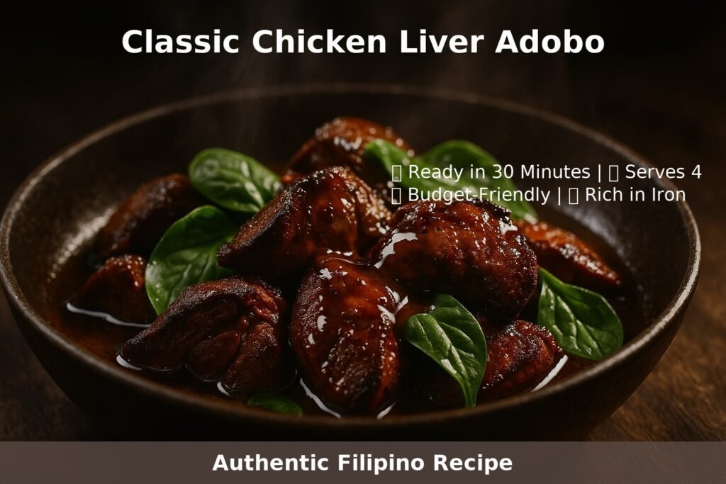 Traditional Filipino chicken liver adobo simmered in soy sauce, vinegar, garlic, and bay leaves. Tender, budget-friendly, and ready in under 30 minutes.