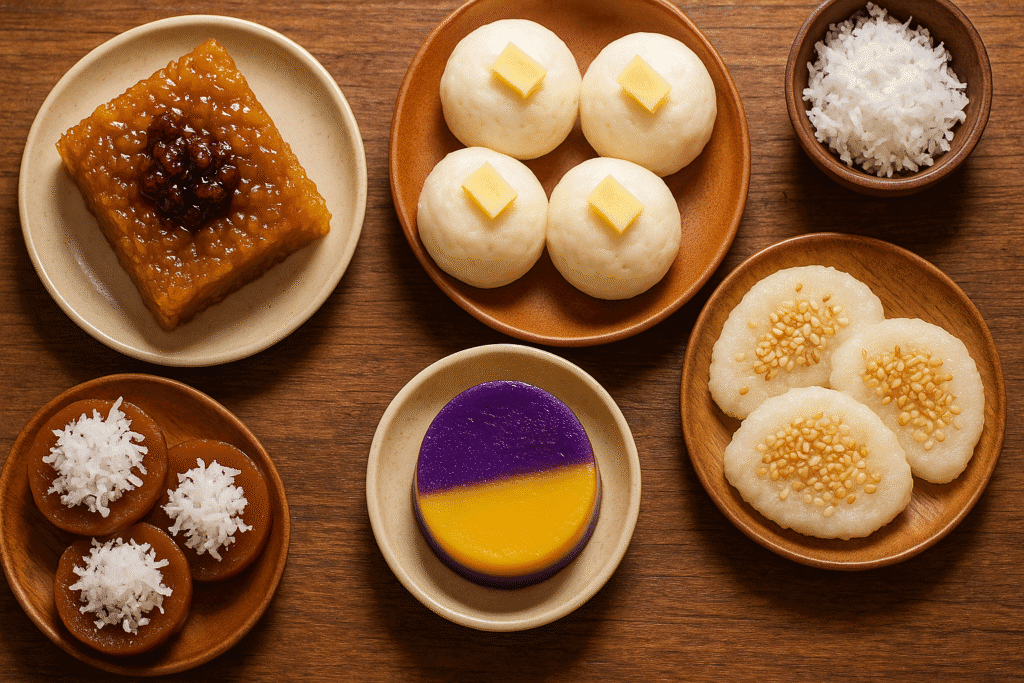 Filipino rice cake snacks (kakanin) assortment featuring biko sticky rice, puto steamed cakes, and kutsinta on wooden table | Traditional Filipino merienda desserts